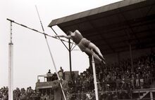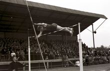Een polstokspringer gaat over de lat op het zomerfeest van Hermes.De tribune zit vol !