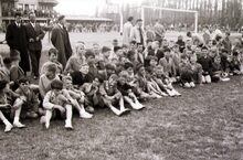 Een groep jonge deelnemers aan het zomerfeest van Hermes op hun stadion.