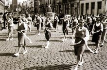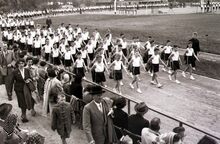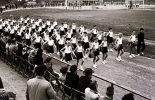 Optocht van de deelnemers aan het zomerfeest van Hermes op hun stadion.