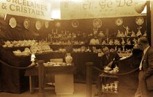 Stand van de handelszaak "Ets.Β GΓ©DΓ©,Β BrabantstraatΒ 5Β Oostende, op de handelsbeurs 1954 te Brussel. Opschrift : Porcelaines & Cristaux