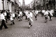 Een groep jongens in de optocht tijdens het zomerfeest van Hermes op hun stadion.