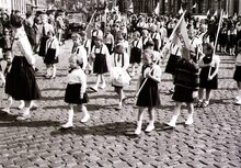 Leopold I plein,bij de Rogierlaan, een groep meisjes in de Maria processie.