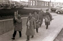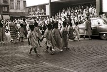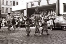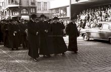 "Chinese" figuranten uit de Maria processie aan het postgebouw in de Hendrik Serruyslaan.Rechts loopt een non in vol ornaat.