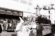 Een praalwagen uit de Maria processie in de Hendrik Serruyslaan,rechts de Poststraat.