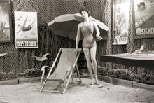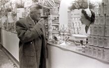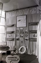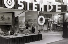Stand van stad Oostende op de Brusselse handelsbeurs 1954 (met een priester erbij).