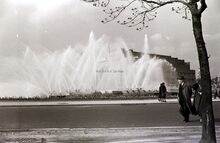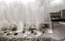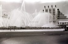 Fontein voor het eeuwfeestgebouw op de Heizel tijdens de Brusselse jaarbeurs 1954.