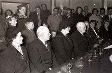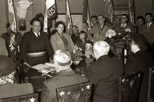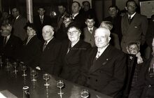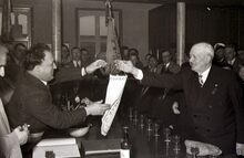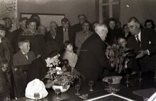 De voorzitter (?) van de vereniging van foorkramers van Sas Slijkens tijdens een ontvangst op het Bredens gemeentehuis.Links burgemeester August PLOVIE.