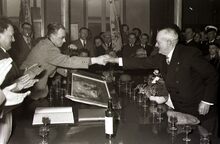 Burgemeester August PLOVIE schudt de hand van een foorkramer van Sas Slijkens tijdens een ontvangst op het Bredens stadhuis.