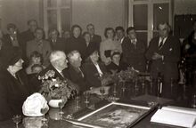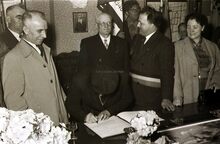Een dame zetΒ haar handtekening in het gulden boek van Bredene tijdens een ontvangst van foorkramers uit Sas Slijkens.Tweede van rechts burgemeester August PLOVIE.