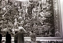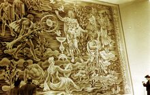 Een wandtapijt op de Heizel te Brussel tijdens de handelsbeurs 1954.