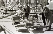 Enkele Oostendenaars amuseren zich op de Heizel te Brussel tijdens een bezoek aan de handelsbeurs 1954.