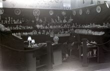 Stand van de handelszaak "Ets. GΓ©DΓ©",Β BrabantstraatΒ 5 Oostende,Β op de handelsbeurs 1954 te Brussel. De uitbater zit erbij.