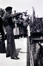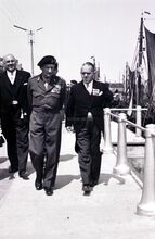 Veldmaarschalk MONTGOMERY en burgemeester Adolf VAN GLABBEKE op de Visserskaai, langs het Montgomerydok. Links, schepen Maurice QUAGHEBEUR.