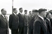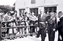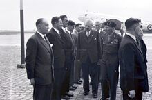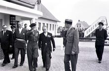 Veldmaarschalk MONTGOMERY bij zij aankomst op het vliegveld van Raversijde. Rechts burgemeester Adolf VAN GLABBEKE. Achter hen de burgemeester van Middelkerke, André TITECA.