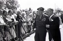 Veldmaarschalk MONTGOMERY en burgemeester Adolf VAN GLABBEKE op de Visserskaai nabij het Montgomerydok.