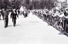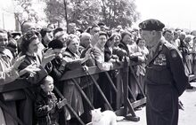 Veldmaarschalk MONTGOMERY wandelt samen met burgemeester VAN GLABBEKE langs het publiek op het Canadaplein.