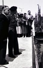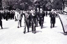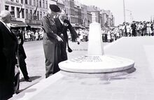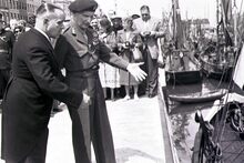 Veldmaarschalk MONTGOMERY en burgemeester Adolf VAN GLABBEKE op de Visserskaai bij het herdenkingszuiltje. Links, schepen Maurice QUAGHEBEUR