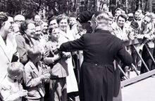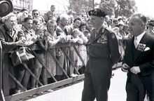 Veldmaarschalk Montgomery en burgemeester Adolf VAN GLABBEKE begroeten de bevolking op het Canadaplein.
