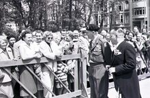 Veldmaarschalk MONTGOMERY en burgemeester Adolf VAN GLABBEKE op het Canadaplein. De vaderlandslievende verenigingen met hun vlaggen vormen een erehaag.