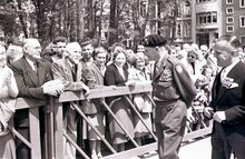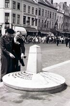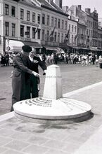 Het Canadaplein. Veldmaarschalk MONTGOMERY, burgemeester Adolf VAN GLABBEKE, achter hen schepenen Maurice QUAGHEBEUR, Jan PIERS en Kamiel DEHOUCK.