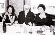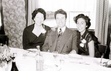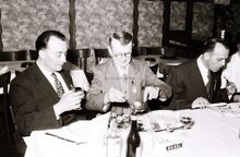 De voorzitter van de kappersvereniging en twee aanminnige kapsters (?) op het jaarlijks banket.