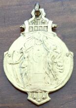 Gedenkpenning in de vorm van een lier, met oog en ring,en is als volgt ingegraveerd: