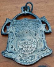 Prijspenning in een onregelmatige vorm, met oog en ring, en is als volgt ingegraveerd: