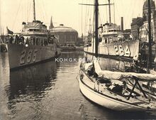 Formaat : 18 x 24 cm. - Twee Amerikaanse torpedojagers in het tweede handelsdok. In de achtergrond het Panorama van de IJzer, rechts de Vindictivelaan, vooraan links een zeiljacht.