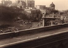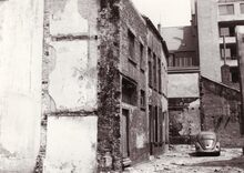 Zicht op de werf tijdens de sloop van de puinen van het Koninklijk ChaletΒ na de Tweede Wereldoorlog.Op de achtergrond de Parijsstraat.