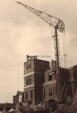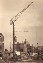 Zicht op de werf met kraan van de bouwonderneming Wwe J. Van Coillie, tijdens de sloop van de puinen van hetΒ KoninklijkΒ ChaletΒ na de Tweede Wereldoorlog.