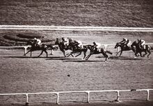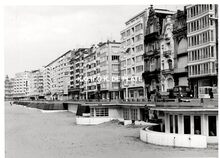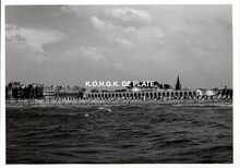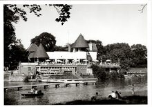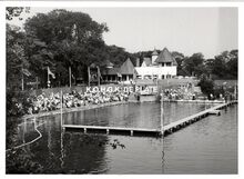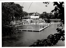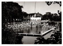 Formaat : 13 x 18 cm. Het zwemgedeelte van de Ostend Swimming Club bij het "Laiterietje" (huidig Koninginnehof) in het Maria-Hendrikapark tijdens een wedstrijd