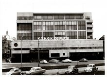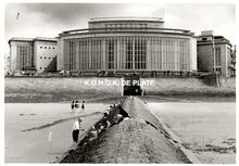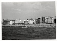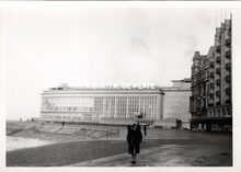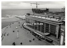 Formaat : 13 x 18 cm. - De noordgevel van de vierde Kursaal langs de Albert I-promenade, gezien vanaf een golfbreker op het Groot Strand.