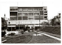 Formaat : 13 x 18 cm. - Het postkantoor aan de Hendrik Serruyslaan in opbouw. Links de Wittenonnenstraat Β en rechts, de Poststraat. Gebouwd naar de plannen van architect Gaston Esysselinck