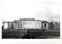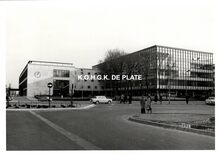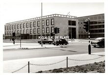 Formaat : 13 18 cm. - De Β vleugel van het stadhuis aan de Leopold II-laan kort na de ingebruikname van het gebouw. We zien het kruispunt met de Vindictivelaan.