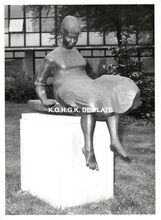 Formaat : 18 x 13 cm. Zittende vrouw in cntract met de drukke activiteiten van het stadhuispersoneel