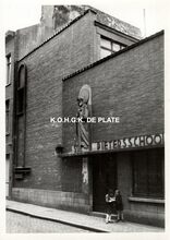 Formaat : 18 x 13 cm. - De (vrije) Sint Pieterschool met gevelbeeld Sint-Pieter aan de voorgevel in de Ooststraat. Gebouw in 1937-1938. Later verbouwd tot kinderdagverblijf