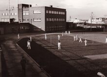 De leerlingen van de Zeevaartschool aan de Slijkensesteenweg tijdens deΒ les lichamelijke opvoeding.