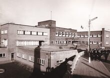 De Zeevaartschool aan de Slijkensesteenweg. De leerlingen marcheren naar een of andere plechtigheid.