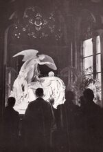 Het praalgraf van onze eerste koningin Louise-Marie in de Sint Petrus- en Pauluskerk. Burgemeester Hendrik SERRUYS legt een krans neer.