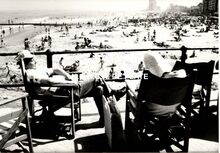 Formaat :Β 9 x 9 cm. - Strandrecreatie op het Groot Strand. Rechts, de badinstallatiesΒ van het Lido onder de Albert I-promenade en op de achtergrond, de westgevel van het vierde Kursaal.
