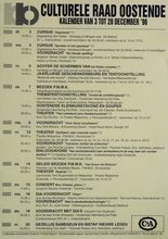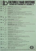 Formaat : 42 x 30 cm. 19/11: Voordracht: "Herwaardering van de vrouwelijke waarden". 20/11: Bezoek Juwelenontwerpster Els Ongenae. 21/11: Voordracht: "Zeg, Luister eens!" door Ann Delye. Voordracht: "Leopold II levensecht en karikatuur" door Dirk Beirens. Cursus: "Alternatieve geneeswijzen" door mevr. A. Desport. 21/11-22/11: Tonnel: "De nacht van de zestiende januari" van Ayn Rand. 21/11-23/11: Tragi-komedie: "De Celliste" door Karel Smets. 22/11: Workshop: Digitale radiotelecommunicatie via PC. Dia-avond: "Israël" door dhr. Luc Simoens. Theatervoorstelling: "Vriendinnen" van Ed Vanderweyden. 23/11: Bezoek atelier Hubert Minnebo. 24/11: Voordracht: "Drugs". Voordracht: "India: Parel der natuur" door dhr. B. Castelein. 26/11: Meditatie Sahaya Yoga. 27/11: Voordracht: "Portugese aanwezigheid te Oostende" door lic. Dirk Oosterlinck. 29/11: Theatervoorstelling: "Demonen" van Lars Norèn. 1/12: Voordracht met illustratiemateriaal: "De wereld van de multi-media". 2/12: Reeks: "Is Marxisme nog actueel?". 4/12: Film: "The Elephant Man".