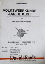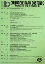 Formaat : 42 x 30 cm. tot 30/01: Thematentoonstelling: "oostende schildersgewijs" door Guy Demarets. 15/12: Concert Mark Erkens, piano. Theater: "Spilliaert, mijn vreemde naam" door Karel Vingerhoets. 16/12: Diavoordracht: "Polen" door dhr. Montaye. Scrabble. Voordracht: "Wat is plantenbiotechnologie?" door prog. dr. Jozef Schell. 17/12: Voordracht: "De menopauze". Volksdansles. 18/12: Voordracht: "Likeurwijnen porto en sherry" 19/12: Gezelschapsspelen en shaken voor senioren. Voordracht met dia's: "Leopold II en Oostende" oor Emile Smissaert. Toneel: "Waar de sterre bleef stille staan" van Felix Timmermans. 20/12: Gezellig samenzijn en instap nieuwe leden. 21/12: Atelierbezoek: Moarigalerij, etnische kunst". Live-uitvoering pianomuziek. Fakkeltocht tegen racisme. 21/12-22/12: Geschenkenbeurs. 22/12: Kerstconcert. 26/12: Gezelschapsspelen voor 50- plussers.