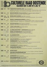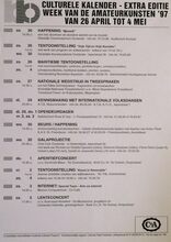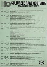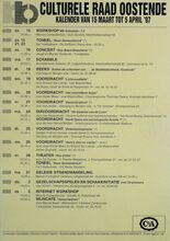 Formaat : 42 x 30 cm. 26/04: Happening: "Mjoezik". 26/04-30/04: Tentoonstelling: "Vrije tijd en Vrije kunsten". 26/04-4/05: Maritieme tentoonstelling. 27/04: Nationaal wedstrijd in tweespraken om het Rikke Schmitzjuweel. 29/04: Kennismaken met internationale volksdansen. 29/04-3/05: Opendeurdagen Balletschool Rose D'Ivry. 30/04: Beurs/happening. Galaprojectie. 1/05: Aperitiefconcert o.l.v. Dominiek maes. 2/04-4/04: Tentoonstelling: "Kunst in Raversijde". 3/05: Internet: Special Topic - Arts on internet. Lenteconcerto.l.v. Koenraad Hinnekint.