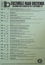 Formaat : 42 x 30 cm. tot 15/09: Thematentoonstelling: "Jazz te Oostende." door dhr. Georges Van Duyvenboden. 9/08: Scrabble. 9/08-10/08: Groepsexpo. 10/08: Geleide wandeling: i.s.m. Toerisme Oostende. 11/08: Geleide strandwandeling. 12/08: Bezoek aan de Speelzaal van het Casino-Kursaal. 13/08: Historische polderwandeling. 14/08: Rondleiding Fort Napoleon. 15/08-21/08: Tentoonstelling Josien Olders. 16/08: Workshop Telebankieren. 18/08: Scrabble. 20/08: Videobespreking: "Sheldrakes morfogenetische velden" door Jean-Pierre Maes. 22/08-28/08: Tentoonstelliing Kenneth Lowyck. 28/08: Voordracht: "De wonderen van Sai Baba" door dr. Deraedt. 29/08: Lezing: "Sjamanisme" door Gererd Debacker. 30/08: Busreis "Noordfranse megalieten" door Erik Colpaert. 31/08: Natuurmeditatie in Noord Frankrijk door Erik Colpaert. 2/09: Scrabble.