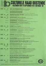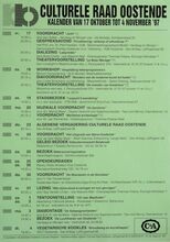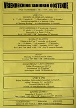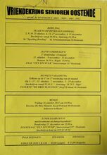 Formaat : 42 x 30 cm. 17/10: Voordracht: "Jicht" door een dokter. Gespreksavond: "Privatisering: verkoop of uitverkoop?" met prof. em. dr. Piet Frantzen. Dialezing: "Labyrinten" door Anne Crivits. Theatervoorstelling: "Le Beau Marriage" door Limelight. 18/10: Workshop: Vergelijking tekenprogramma's. Diavoordracht: "Moeders vand e moderne kunst tot heden" door Linda Smismans. Theatervoorstelling: "De meester van Koekelare." 19/10: Stadsbezoek: "Leopold II-Wandeling" o.l.v. een stadsgids. 20/10: Muzikale voordracht: "De Symfonie" door dhr. Marcel Maes. Voordracht: "Maritieme archeologie." door dr. Jan Parmentier. 23/10: Algemene vergadering culturele raad Oostende. 24/10: Voordracht: "Het vliegveld van Stene-Oostende" door dhr. Walter Major. Geleid bezoek Volkssterrenwacht Beisbroek. 25/10: Bezoek waterzuiveringsstation. 25/10-26/10: Opendeurdagen Racoo. 30/10: Voordracht: "De MoerzeeΓ«n in de Noordzee" door Ir. Van Cauwenbergh. 31/10: Lezing: "Mijn bijna-dood-ervaringen en hun gevolgen" door Guy Vander Linden. 1/11-2/11: Tentoonstelling: "150 Jaar Maalboten". 3/11: Diamontage: "De Galapagoseilanden" door E.H. Fr. Van De Walle. Beozek: "De luchthaven van Oostende.". 4/11: Vegetarische Kookles: "Broodbeleg en borrelhapjes".