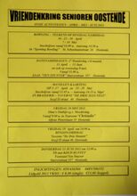 Formaat : 42 x 30 cm. 15/03: Workshop MS Schedule+ 7.0. 15/03, 21,03-22/03: Toneel: "Baas Gansendonck". 16/03: Concert: "Duo Baert-Stancheva". 17/03: Scrabble. 18/03: Reeks: "Achter de schermen van ... de Stadsbibliotheek Oostende." 19/03: Voordracht: "Licht-meditatie" door Roland Van Lierde. 20/03: Voordracht: "Het onzichtbare begin" door Guido Maes. 21/03: Voordracht: "zwaarlijvigheid". 24/03: Diavoordracht: "De kastelen van de Loire" door Jan Deceunicnk. Voordracht: "Heeft Opera een sociologische functie?" door dhr. Gerard Mortier. 25/03: Voordracht: "Ziekenhuisopname" door Patricia Vyncke. 26/03: Voordracht: "Aura's zien en voelen" deel 2 door Jean-Pierre Maes en Roland Van Lierde. 28/03: Theater: "Rue d'Ulm" door De Parade. Toneel: "Baas Gansendonck." 31/03: Geleide strandwandeling. 3/04: Gezelschapsspelen en schaakinitiatie voor 50- plussers. 5/04/ Internet workshop. WijncafΓ© "Dessertwijnen" door Marcel Braet.