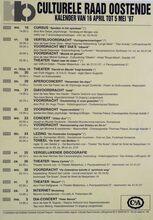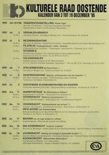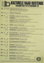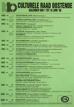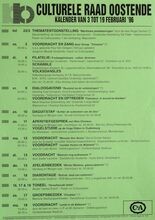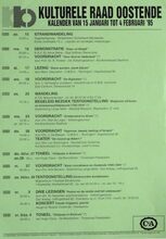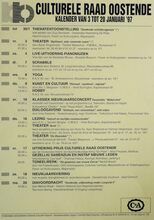 Formaat : 42 x 30 cm. tot 30/1: Thematentoonstelling: "Oostende schildersgewijs" met Guy Demarets. 3/01: Theater: "Spilliaert, mijn vreemde naam" door Karel Vingerhoets. 4/01: Live-uitvoering pianomuziek. 7/01: Scrabble. 8/01: Yoga. 9/01: Kunst en cultuur: "Sieraad - Symbool - Signaal door dhr. J. Walgrave. Hobby. 10/01: Klassiek nieuwjaarsconcert Ensemble "Watervliet". Dialoogavond: "Vietnam, een reisverhaal", met video door Irma Declerck. 16/01: Lezing: "Geloof en eerlijke communicatie" door E.H. J. Vanden Berghe. Theater: "Anxt'. Theater: "De bezoeker" van Erik-Emmanuel Schmitt. 17/01: Uitreiking prijs culturele raad Oostende. Gezellig samenzijn en instap nieuwe leden. Toneelwerk: "De geweren van vrouw Carrar" door het Fakkeltheater. 18/01: Nieuwjaarsviering. 20/01: Diavoordracht: "Oostende, uitbreiding onder Leopold II" door Marcel Braet.