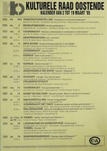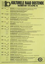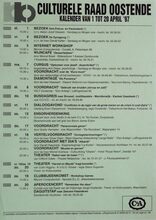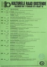 Formaat : 42 x 30 cm. tot 18/04: Thematentoonstelling: "Oostende en de binnenscheepsvaart" door dhr. F. Gevaert. 2/03: Bedrijfsbezoek: Struisvogelkwekerij door dhr. Luc Goethals. 6/03: Voordracht: "Vlaamse volksmuziek en rondneuzen in instrumenten" door dhr. R. Hessel. 7/03: Gespreksavond rond "oud hout". 9/03: Info-avond: "Echtscheidingsproblemen in de praktijk". Voordracht: "Jacques Brel". Cursus: "Twee is een groep" door Isabelle Paulus. 10/03: Cursus: "Omtrent kruiden" door Anny Vanbranteghem. Audiovisuele dia-show: "Istanbul - Kaapstad" door Bart Castelein. 12/03: Concert: "Harfago" duo harp en fagot. Polderfietstocht. 13/03: Voordracht: "Drie geluidswerelden" door prof. dr. J. Kruithof. 14/03: Kunst en cultuur: "Verhuld verdriet, Wenen in de tijd van Schubert" door dhr. I. Meersman. 17/03: Diavoorstelling: "20 jaar hooggebergte" Voordracht met dia's: "Oostendse gevels schrijven geschiedenis" door Yvan Van Hyfte. Dialoogavond: "Zaire: de mislukking van een democratie op z'n westers." inl. Walter Zinzen. 17/03-19/03: Toneel: "Koffie" van Knarf van Pellecom. 18/03: Ledenavond en diareportage: "De Auvergne". Toneel: "Koamer 153" door Flor Barby's. 19/03: Gespreksnamiddag: "Doping: Alleen bij topsport".