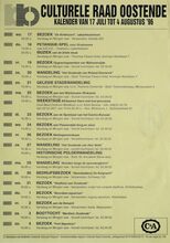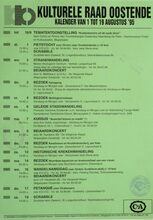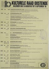 Formaat : 42 x 30 cm. 17/07: Bezoek: "De Kinkhoorn", Vakantiecentrum. 18/07: Petanque spel voor 50 plussers. Muziek van de 20ste eeuw. 19/07: Bezoek opgravingswerken Van Walraversijde. 20/07: Wandeling: "Het Oostende van Roland Desnerck." 21/07: Geleide strandwandeling. 22/07: Bezoek aan een Wijnbouwer. Weekstage Afrikaanse Dans met live-percussie. 23/07: Bezoek aan de speelzaal van het Casine-Kursaal. 24/07: Bezoek aan Plassendale brug en sluis. 26/07: beozek Wellingtonrenbaan. 27/07: Wandeling: "Het Oostende van Herr Selle". Historische polderwandeling. 29/07: Wandeling: "Kruiden langs de spoorwegbern" 30/07: Bedrijfsbezoek: "Steenbakkerij De Keignaert." 31/07: Bezoek: "Stadhuis Oostende". 1/08: Bezoek: "Noordzee-aquarium". 2/08: Bezoek aan de Beiaard. 3/08: Boottocht: "Maritiem Oostende". 4/08: Bezoek: "Fort Napoleon".