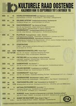 Formaa t: 42 x 30 cm. 15/09: Voorlichtingsavond over Esperanto (-cursussen). 16/09: Geleide uitstap: "Paddestoelenwandeling" Bulskampveld. 18/09: Diavoordracht: "Van Verona tot Perugia" door dhr. Jan Deceuninck. Voordracht: "Voorplantingsproblemen bij mannen" door dhr. Johan Malcorps. 19/09: Filatelie: Postzegelnieuws - ruilen -diversen. Volksdanscursus. "Internationale Volksdansen". 21/09: Startavond. 23/09 tot 15/01/96: Thematentoonstelling: "Paster Pype". door dhr. J.B. Dreesen. 24/09: Fietseling voor een leefbaar en veilig Oostende. 25/09: Diamontage: "Iers Festival" door dhr. en mevr. S. en K. De Leger. 27/09: Geleid bezoek: "Loodswezen en Loodsboot". 28/09: Voordracht: "Paster Pype" door dhr. J.B. Dreesen. 29/09: Muziekavond: "Muziekwerken: anders - beter" door dhr. Herman Van Cauwenberghe. 30/09-1/10: Tentoonstelling: "14de Treinweekend van Oostende." 3/10: Actualiteitenreeks: "In de kijker". 4/10: Cursus: "Goden, Vrouwen en Geneeskunde in de Griekse-Romeinse oudheid door dhr. P. Elsen. 5/10: Kunste en cultuur: "China, Draak of Tijger?" door dhr. Freddy De Pauw.